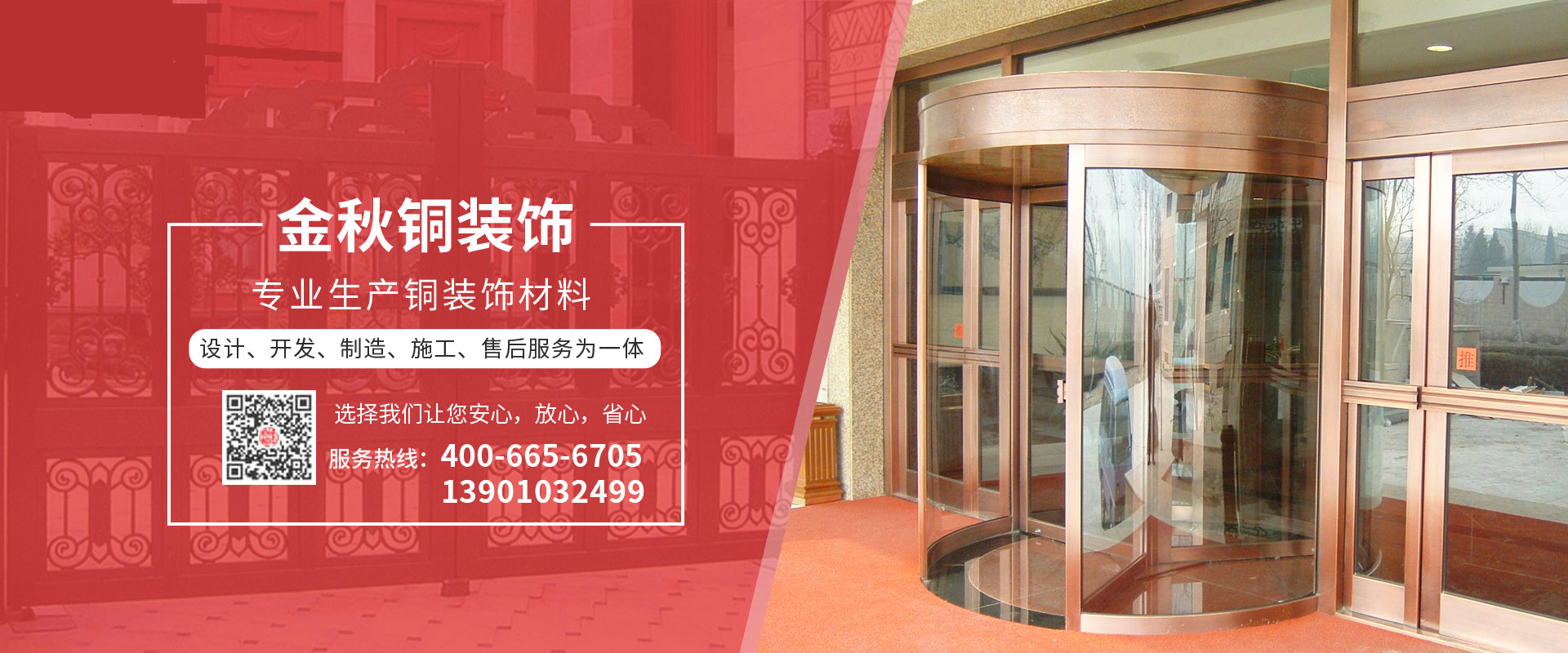 北京金秋銅裝飾材料有限公司是專業(yè)生產(chǎn)銅裝飾材料及設(shè)計、開發(fā)、制造、施工、售后服務為一體的大型綜合企業(yè)。可承接建筑銅裝飾工程及五星級酒店、別墅、博物館、樓樘管所等高檔銅裝飾項目;生產(chǎn)各種規(guī)格的旋轉(zhuǎn)門、平滑門、別墅門、電控門、工藝門、旋轉(zhuǎn)護欄、屋頂銅飾防水瓦、浮雕壁畫......